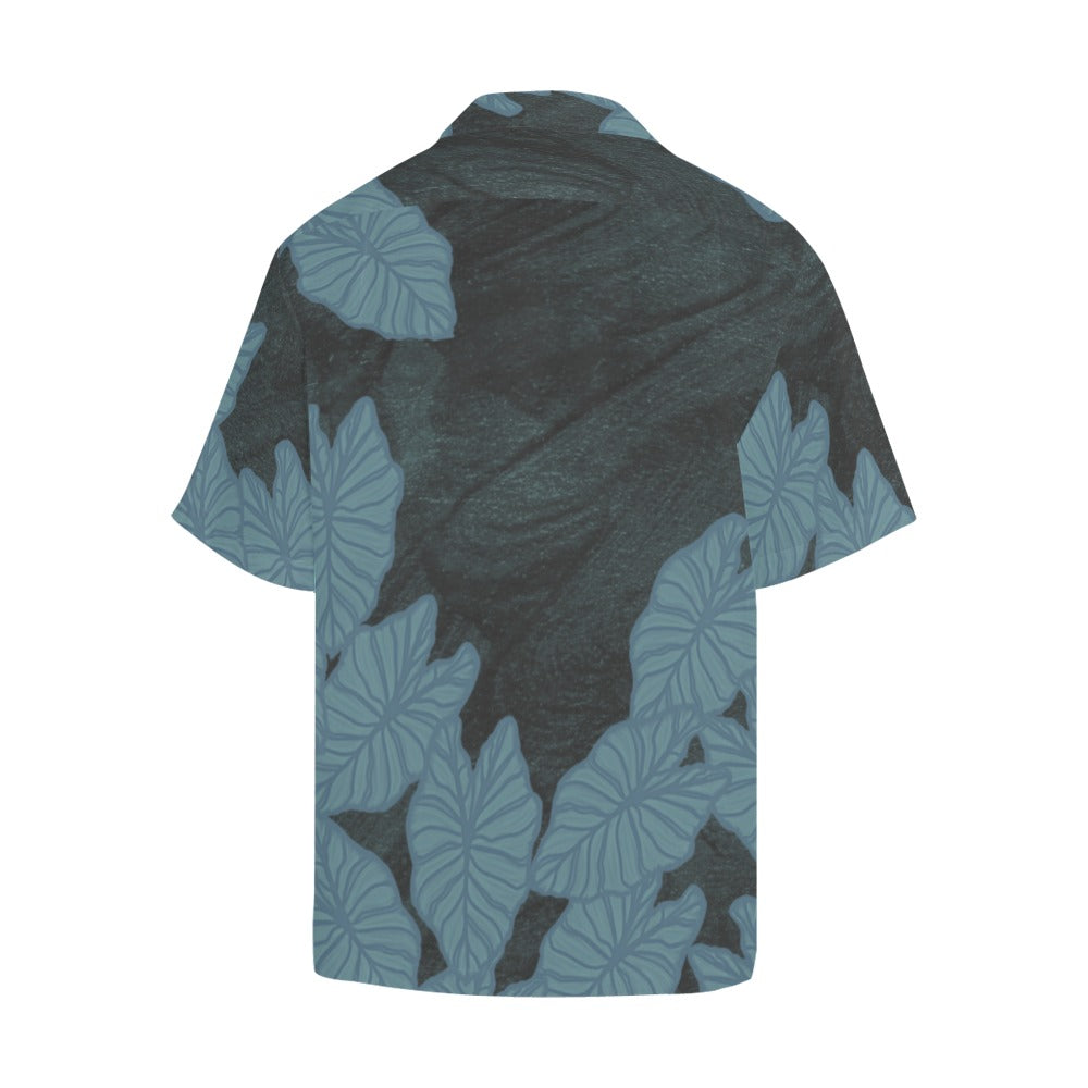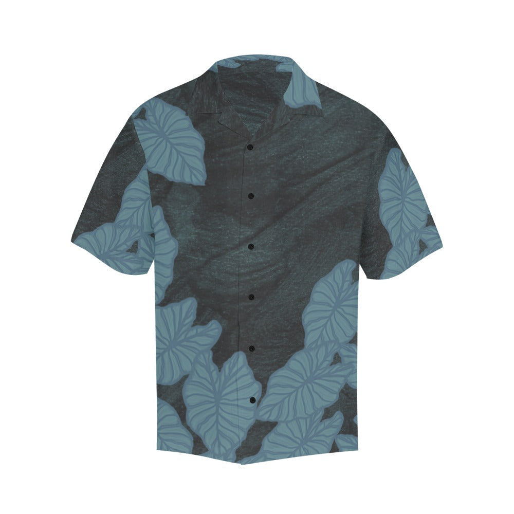This simple button-down Men's Aloha Shirt Features illustrations of the Kalo Taro leaf in a soft gray/blue shade on a watercolor background. Illustrations and watercolor by Honey Kaho'ohanohano.