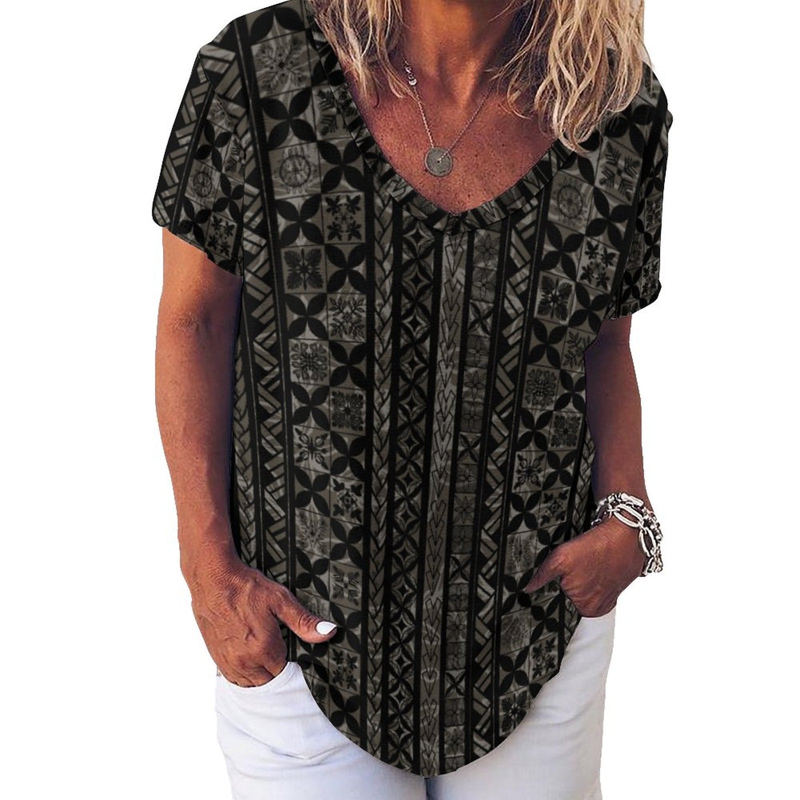 Kapa Kakau Hawaiian Print, Keahi V-Neck Short-Sleeve Shirt - Gray and Black