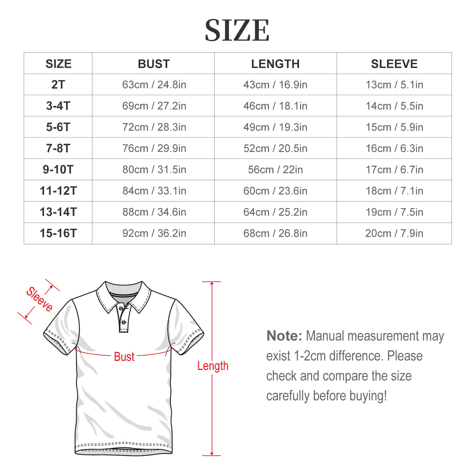 Please note - the size listing has different names for sizing. Please look at the sizing chart and measurements when placing your order. For example - 16T would equal to a children's size XL according to a standard U.S. Apparel Size Chart. Please check measurements appropriately as we do not offer returns or exchanges due to incorrect sizes ordered.